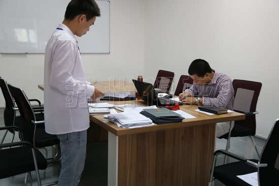 资料核查,检验员灰常认真的检查了我们的公司资料,包括营业执照证书、生产制令单和销售合同等资料。